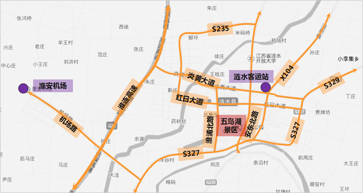 景区对外交通便利 景区与S327、X104、红日大道、淮连高速等交通干道联系便捷。 距涟水客运站仅3公里,距淮安机场仅15公里。