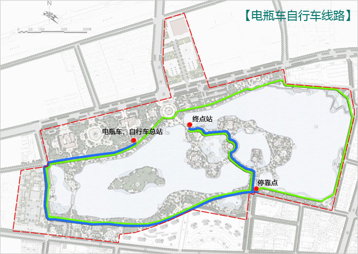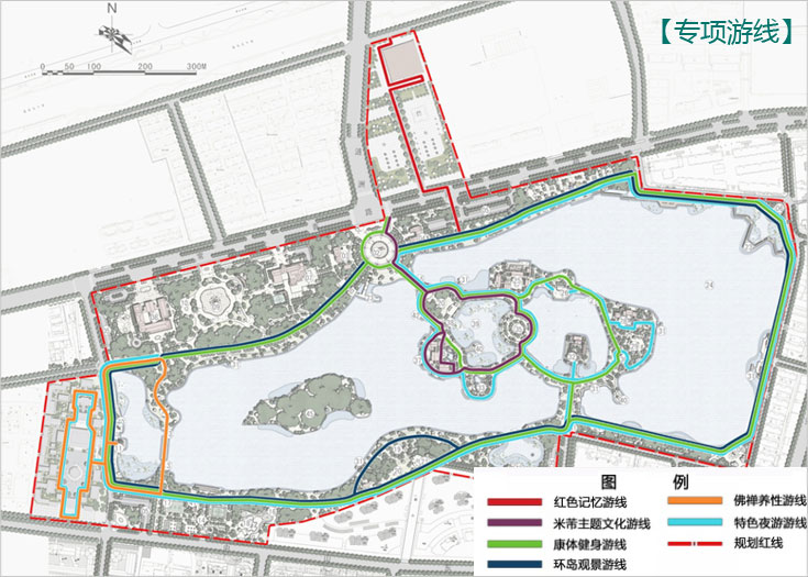 涟漪广场 → 涟漪胜境 → 十二生肖广场 → 兰堂同乐(同乐堂) → 墨香亭 → 米公广场 → 米公亭 → 墨池飞雾(米公洗墨池) → 爱莲亭 → 西苑(盆景园) → 柳岸风荷