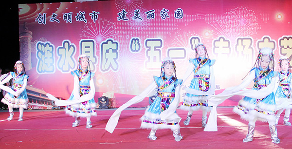 为营造争创省级文明城市的浓烈氛围,日前,由县文广新局主办、县文化馆承办的“创文明城市 建美丽家园——涟水县庆‘五一’专场文艺晚会”在五岛湖公园北大门广场举行。图为北京精灵豆舞蹈学校表演的少儿舞蹈《幸福格桑花》。(马凌云 摄 2017.5.3)