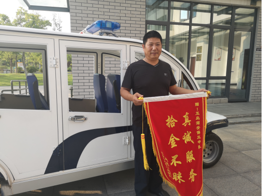 安保队员刘君成在巡逻时捡到一只女式小包,交到安保办公室打开后发现包里有现金800多元,卡数张,通过多种方法终于找到失主……