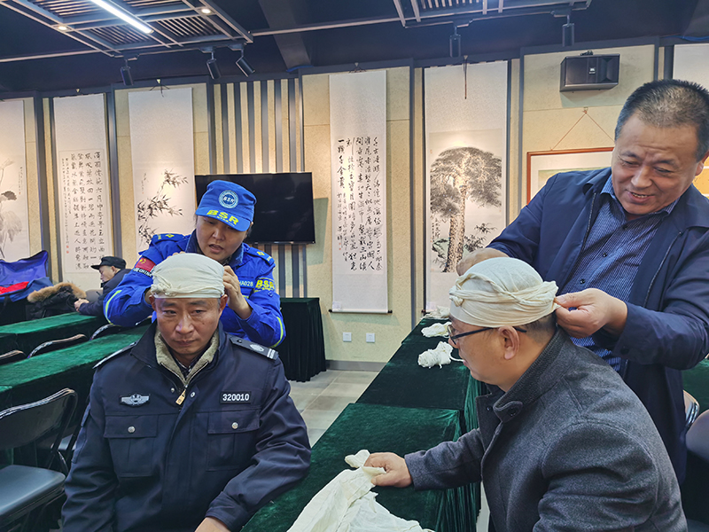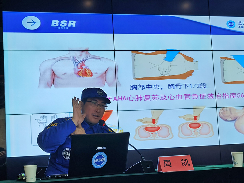在理论培训过程中,按照应急救护培训标准化要求,由蓝天救援队的周凯培训师采用理论与实际操作相结合的方式,详细讲授并演示 “救护新概念”、“现代救护的特点和现场救护的原则”、“生命链和救命的黄金时间”、“止血包扎”、“海姆立克急救法”、“骨折固定”等基本应急救护知识。