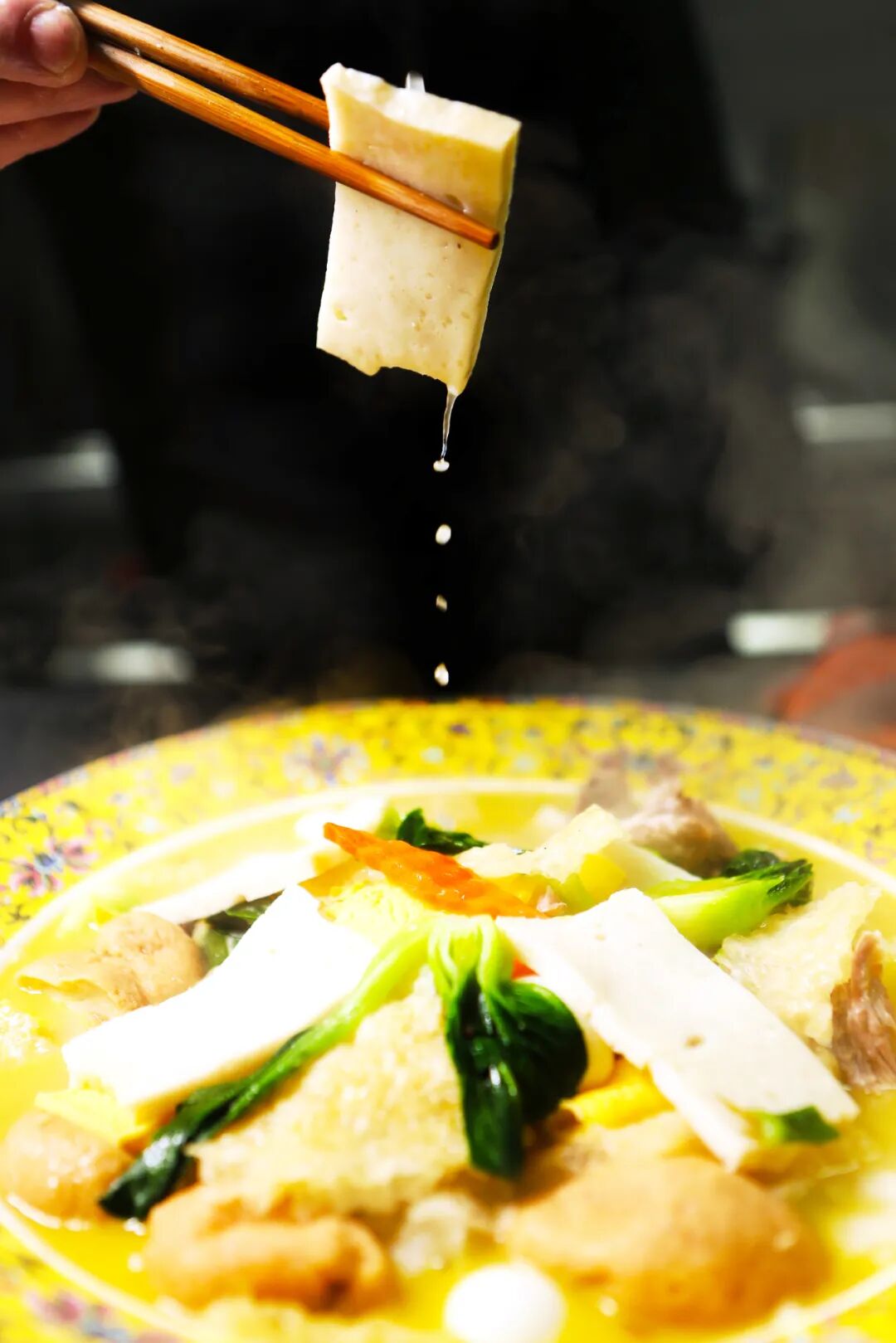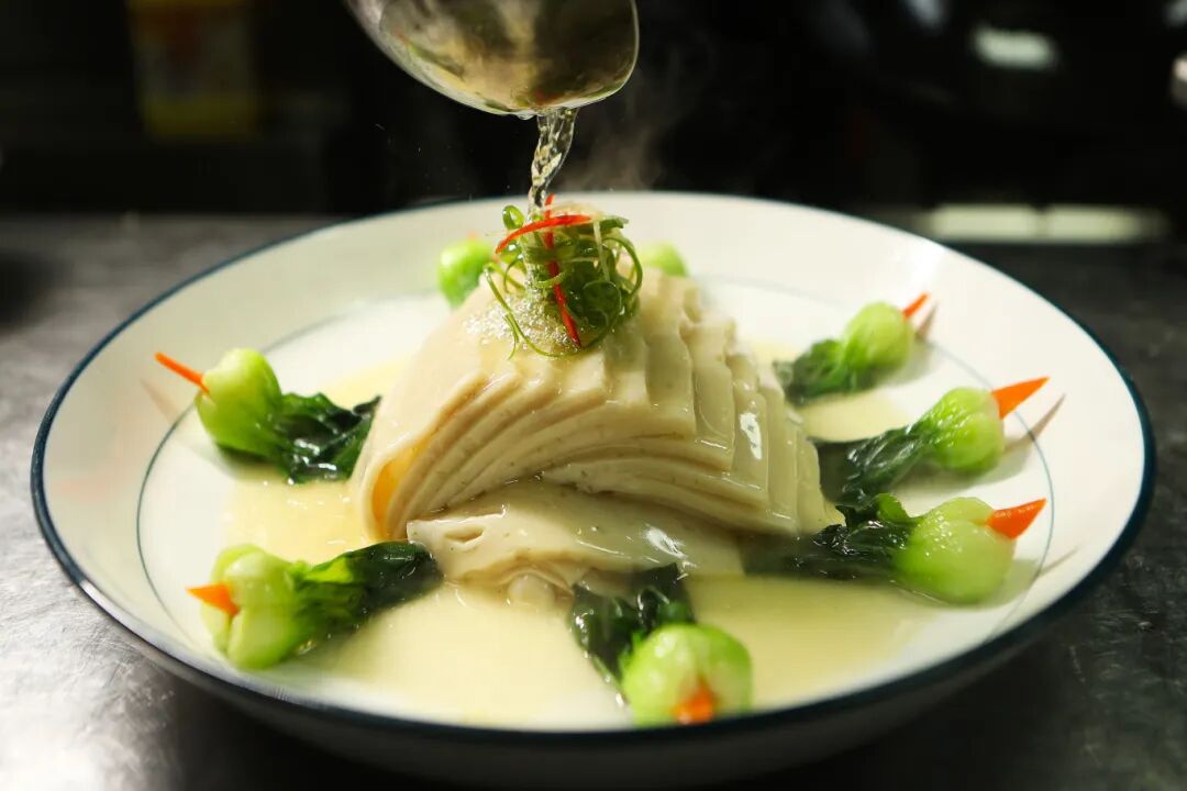这道菜鲜香味美,清爽适口,是淮安人家常宴席的经典菜品。制作时,先把鸡糕切成均匀的薄片,上锅蒸热后备用;接着,将海鲜菇、杏鲍菇、千张等食材一起焯水。然后,起锅烧油,放入葱姜炸出香味,再加入高汤煮沸,把焯过水的菌菇等食材放入锅中炖煮,并调入盐、胡椒等调味料提鲜。将煮好的食材装入盘中,再把蒸热的鸡糕倒扣在食材之上;随后,将青菜焯水后摆盘,围在菜品四周。最后,淋上勾芡好的鸡油玻璃芡,撒上三丝(葱丝、红椒丝、生姜丝)提味,一道色泽鲜亮、鲜香四溢的淮安三鲜便完成了! |
