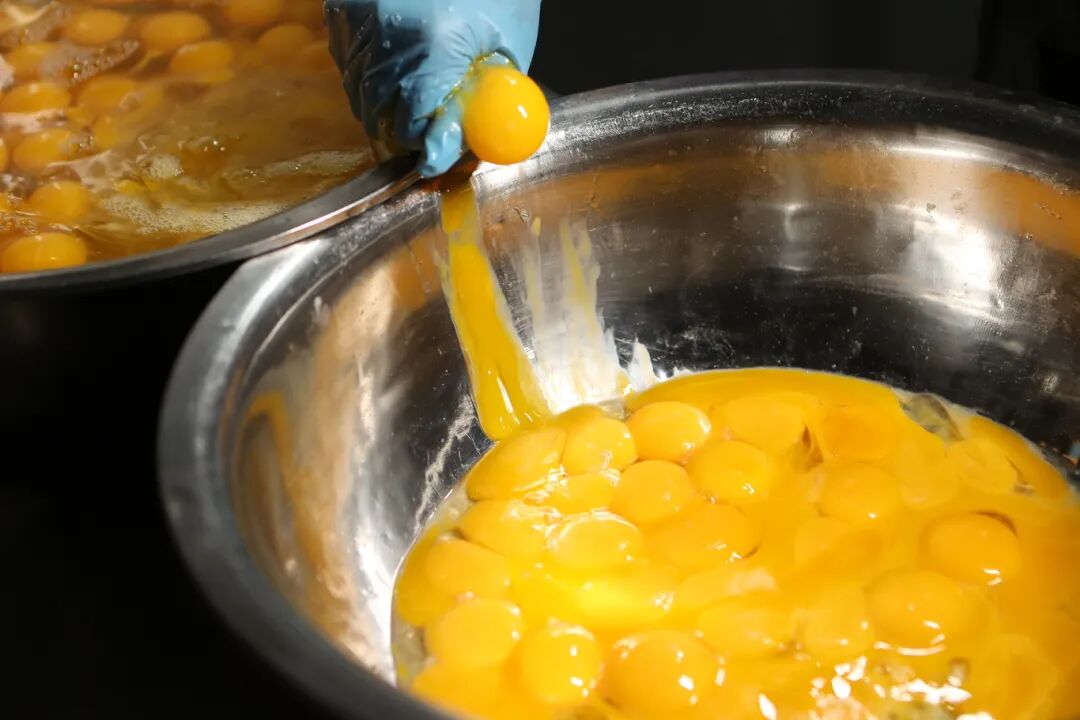 走进金山鸡糕作坊,新鲜的鸡脯肉、猪肥膘码得整整齐齐,分离好的蛋黄、蛋清分盆盛放。金山介绍,鸡糕的主料选用新鲜鸡脯肉与猪肥膘,辅以鸡蛋清、山芋粉,再搭配葱姜调和滋味。“鸡脯肉肉质紧实有营养,猪肥膘能使鸡糕口感润泽,蛋清锁嫩,山芋粉塑形,葱姜去腥,少一样,便少了那份地道滋味。”