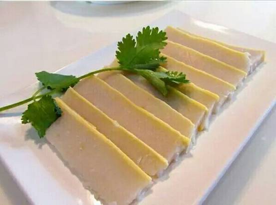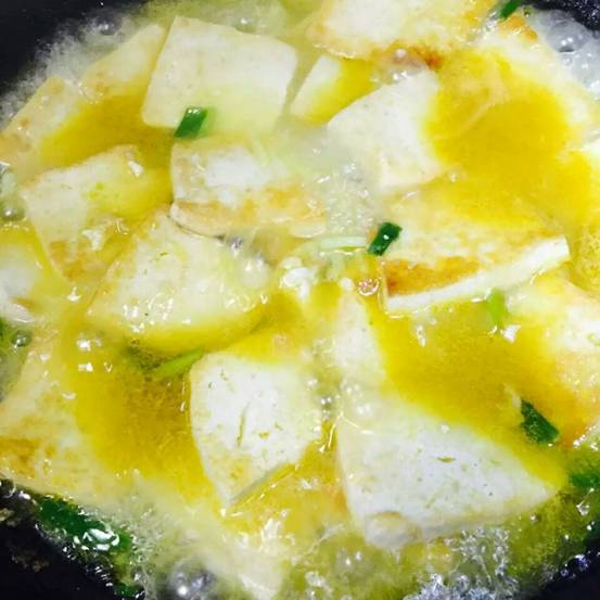 虽没有淮安平桥豆腐名头响,却是地地道道的家乡美食。讲究的是煎功,要将豆腐的一面煎得金黄透亮,然后凉水浇锅,顿时一溜吱吱脆响,豆腐的芳香四溢。加入盐、糖、味精等调料,小火慢炖30分钟,至汤水发白发浓,加入葱段,勾芡即可。