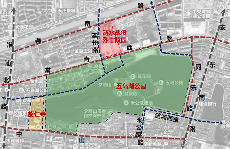 景区周边交通便捷 策划范围:景区西至能仁寺景区西侧,东至同乐路,北至渠南路,南至中山路。 周边交通便利,景区紧邻: 主干路:安东南路、淮浦北路 次干路:中山路、同乐路、常青西路、渠南路 支路:米公路、涟漪西路