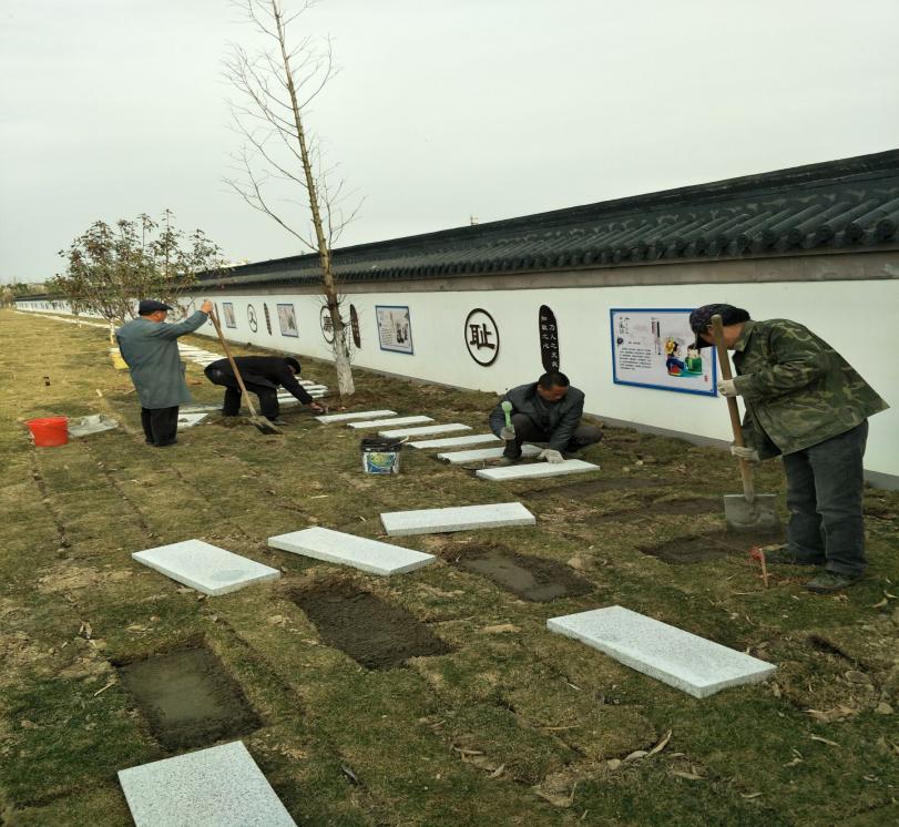 由于文化墙修筑在绿化带旁边,一旁就是草坪。游人要想参观文化墙,就必须踏过草坪才行。时间一长,草坪生长势必受到影响。为方便游人近距离欣赏文化墙,3月刚过,县园林管理处即组织工人沿文化墙铺设汀步。铺设采取10mm混凝土基础浇筑,上面再铺设石材的施工工艺。所选石材是特地从山东购进的五莲花牌专用汀步石材,整个汀步长240米,使用石材306块。