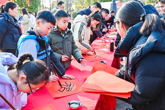 在开幕式上,民俗展演队、玩偶特型队等约100余人围绕五岛湖景区踩街暖场,通过巡游送福礼,营造满满的惊喜和祝福。在文艺演出中,少儿群口快板相声《十二生肖拜大年》、独唱《想念涟水》、反串表演《梨花颂》、汉服秀《江山无限》、小淮戏《七月七》、舞蹈《满庭芳》、舞蹈《我的祖国》等舞蹈、相声、舞台剧、小品、淮剧等特色节目轮番上阵,每一个节目都融入了浓厚的节日元素和地方特色,演员们用满满的热情和精湛的技艺,让现场观众近距离感受民俗文化和传统艺术的魅力。布艺、烙铁画、玉米皮创意编织、剪纸、棕编、虎头鞋、鸡糕捆蹄等非遗项目吸引了不少市民前来采购,特别是嵇氏蜂蜡、郑氏骨伤热敷、蒋氏膏药等中医药专家义诊,让市民们进一步感受到非遗文化,打造了沉浸式的消费场景,丰富了市集的趣味互动体验。书法惠民环节更是精彩纷呈。书法家们挥毫泼墨,将一副副吉祥如意的春联送到家家户户,寄托着人们对新一年的美好祝愿。孩子们围在书法家身旁,目不转睛地观看,感受着书法的魅力。