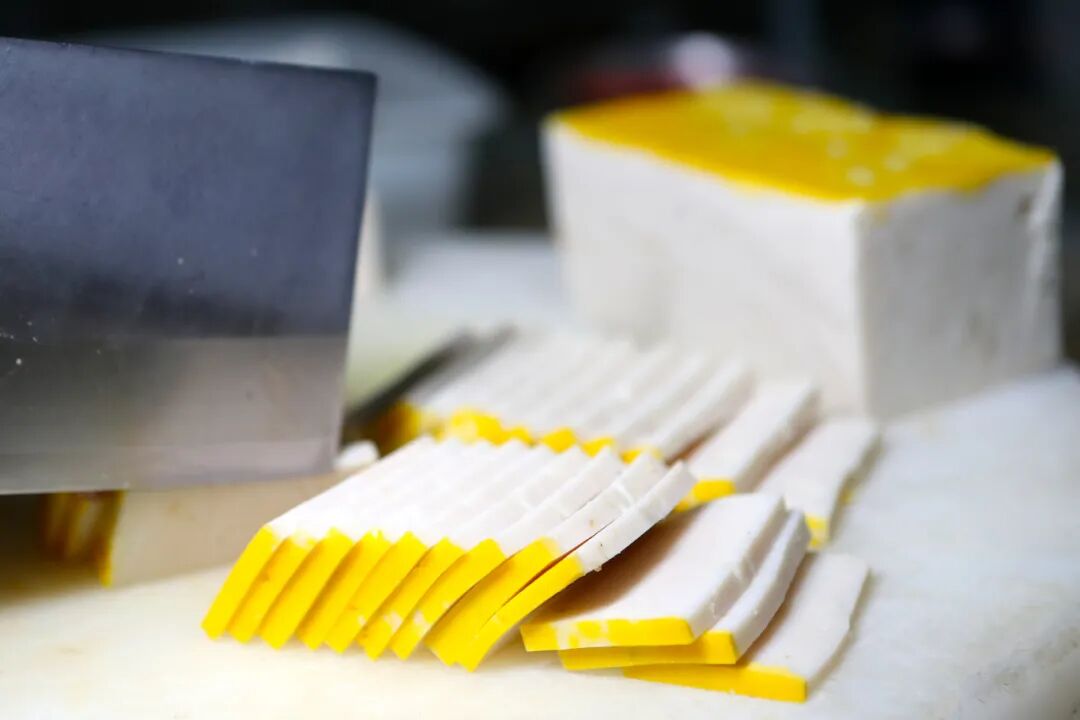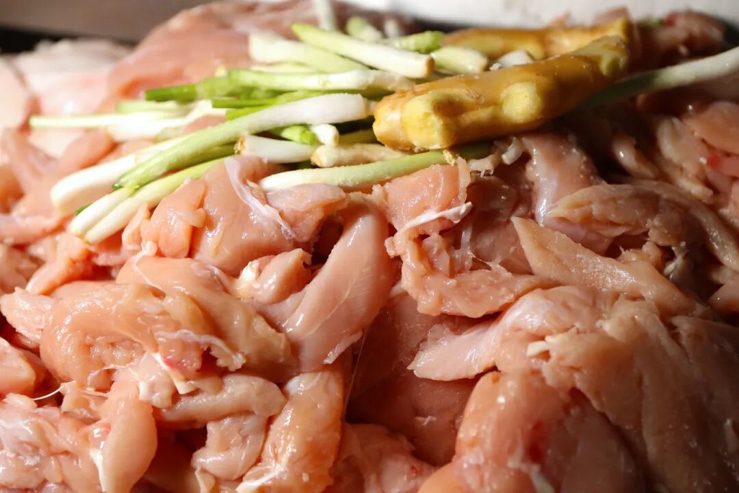 走进金山鸡糕作坊,新鲜的鸡脯肉、猪肥膘码得整整齐齐,分离好的蛋黄、蛋清分盆盛放。金山介绍,鸡糕的主料选用新鲜鸡脯肉与猪肥膘,辅以鸡蛋清、山芋粉,再搭配葱姜调和滋味。“鸡脯肉肉质紧实有营养,猪肥膘能使鸡糕口感润泽,蛋清锁嫩,山芋粉塑形,葱姜去腥,少一样,便少了那份地道滋味。”
