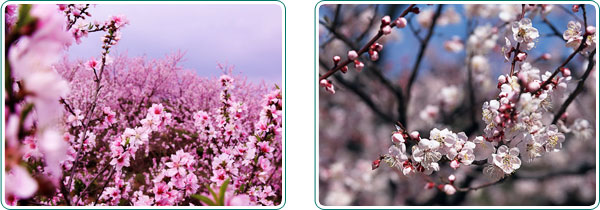 桃(学名:Amygdalus persica L.):蔷薇科、桃属植物。落叶小乔木;叶为窄椭圆形至披针形,长15厘米,宽4厘米,先端成长而细的尖端,边缘有细齿,暗绿色有光泽,叶基具有蜜腺;树皮暗灰色,随年龄增长出现裂缝;花单生,从淡至深粉红或红色,有时为白色,有短柄,直径4厘米,早春开花;近球形核果,表面有毛茸,肉质可食,为橙黄色泛红色,直径7.5厘米,有带深麻点和沟纹的核,内含白色种子。